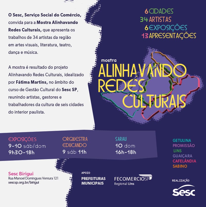 “Mostra Alinhavando Redes Culturais” tem como objetivo propiciar aos trabalhadores da cultura dos pequenos municípios da microrregião de Lins, a oportunidade de uma experiência prática e formativa em todas as etapas, desde a idealização, a escrita, a produção e a realização de um projeto cultural. A programação será realizada no Sesc Birigui e contempla “Exposições” de artistas plásticos e visuais, nos dias 09 e 10/11 das 09:30h às 18h; “Orquestra Educando” de Sabino 09/11 às 11h e fechando a programação o “Sarau” dia 10/11 às 16h. Todas as apresentações são gratuitas e direcionadas a um público diverso, convidando a todos a prestigiarem os artistas locais e a rede que vem se formando.