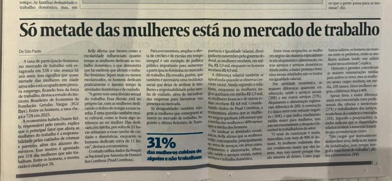 A taxa de participação feminina nomrcado de trabalho brasileiro está estagnada em 53% desde 2018, segundo estudo do FGV Ibre. O levantamento indica que quase metade das mulheres em idade ativa permanece fora da força de trabalho, motivada principalmente pela sobrecarga de tarefas domésticas e cuidados familiares. Enquanto elas dedicam 21,6 horas semanais ao trabalho não remunerado, homens gastam 11,8 horas. O cenário é agravado por desigualdades raciais, com maior impacto sobre mulheres negras em vulnerabilidade econômica.