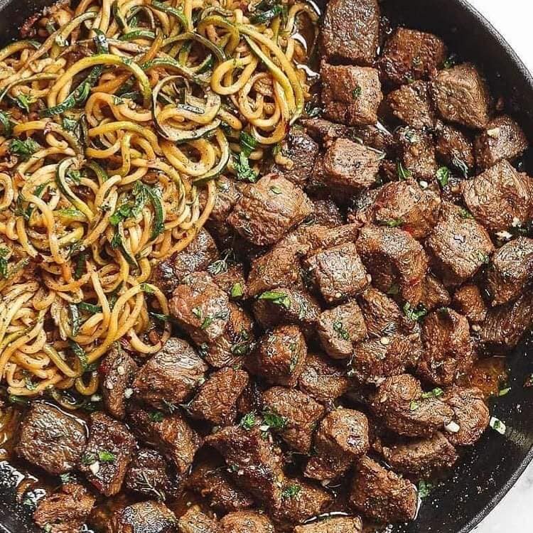 Bife de manteiga de alho com macarrão de abobrinha