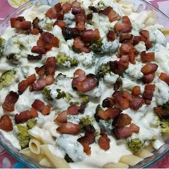 Macarrão ao molho branco com bacon e brocólis