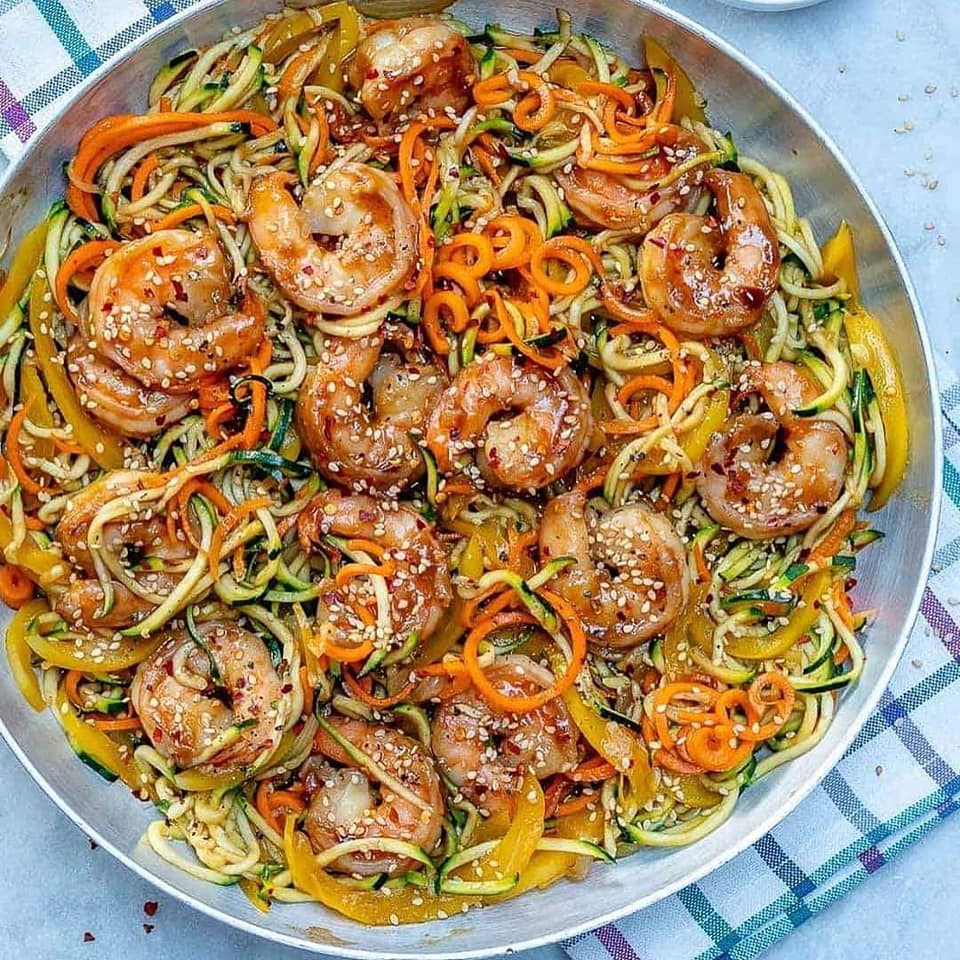 Adicione o macarrão de abobrinha e o camarão cozido à panela e mexa bem para combinar.