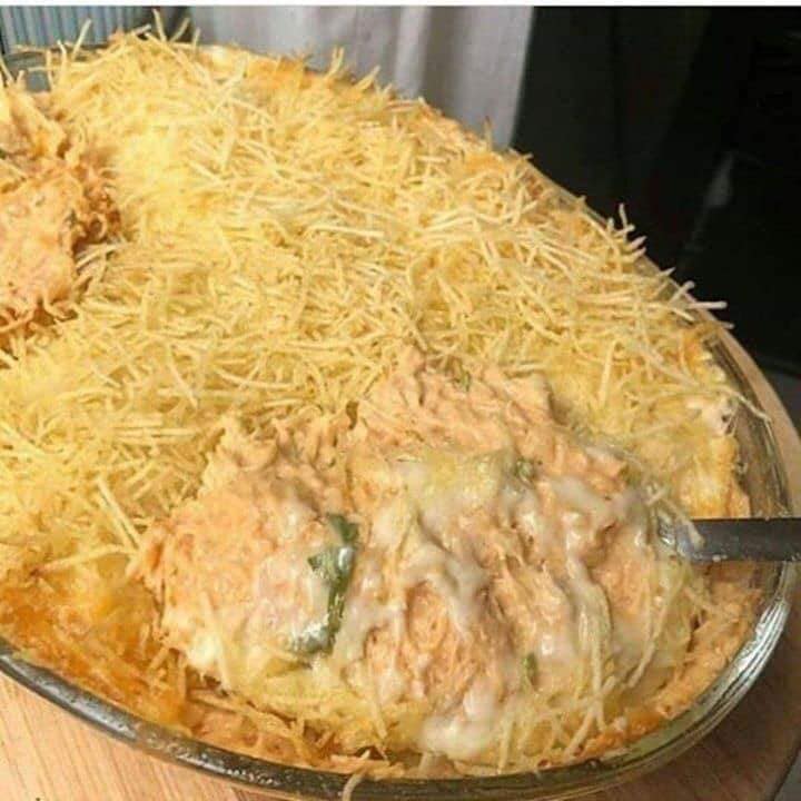 Em uma travessa adicione todo o frango, coloque a muçarela por cima e a batata palha ou batata doce palha por cima, leve ao forno pré-aquecido à 180 graus por 20 minutos e pronto.