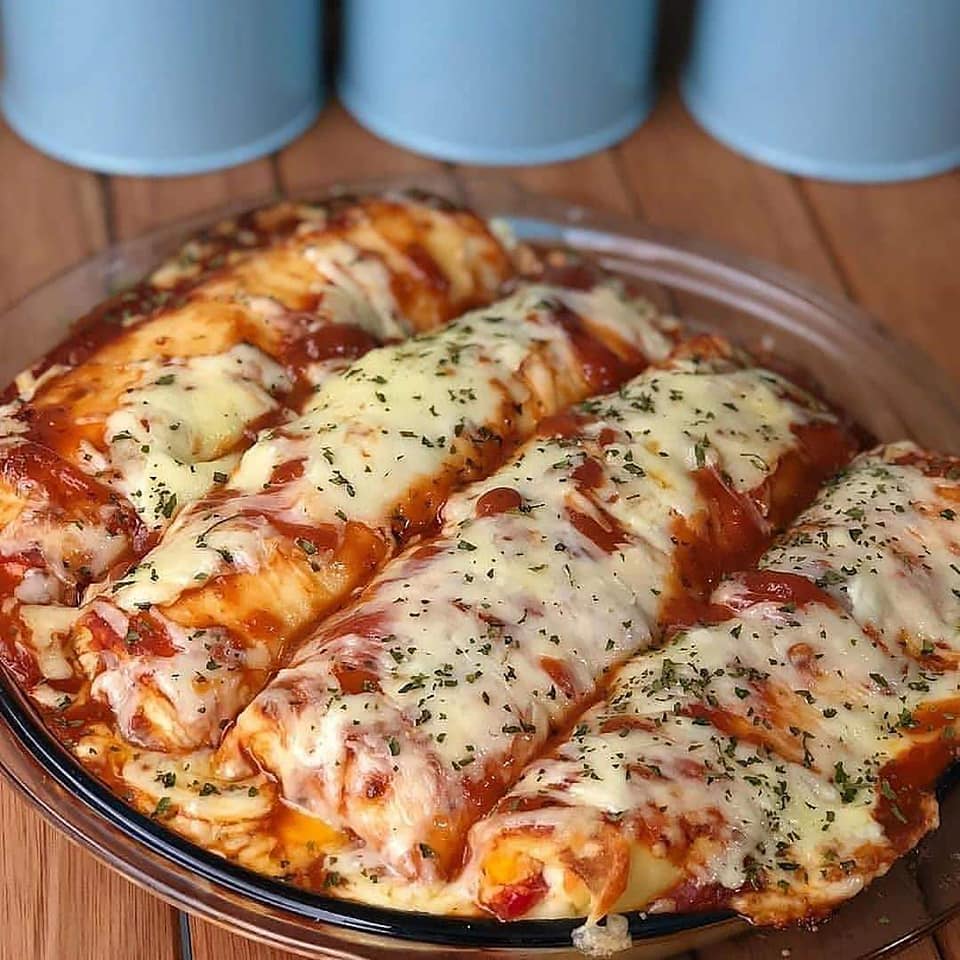 Coloque todas em uma forma que possa ir ao forno, despeje 400ml de molho de tomate por cima, e 300 gramas de queijo muçarela, leve ao forno à 180 graus até o queijo derreter.