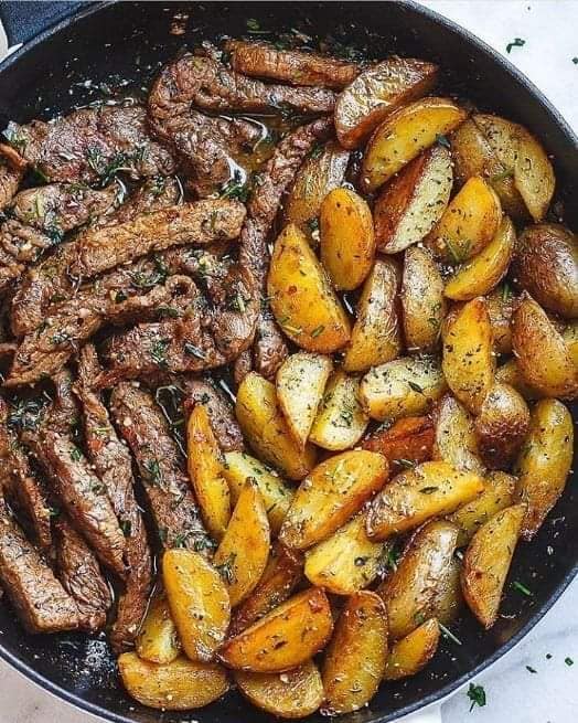 Retire do fogo e sirva imediatamente as tiras de fraldinha e as batatas.